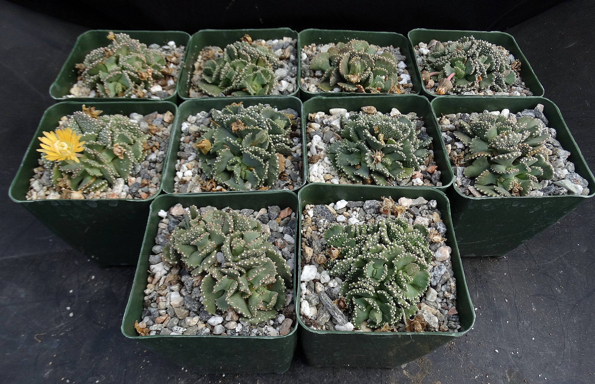 Aloinopsis malherbei  An attractive little clumping Mesemb with warty leaf tips.   Produces fleshy spade shaped leaves that have numerous warts on the edges.  Flowers  yellow.   Easy to grow.  It is a winter grower so give it more moisture in the cooler months and hold back on the water in the summer.  Readily forms clumps. Protect from frost.