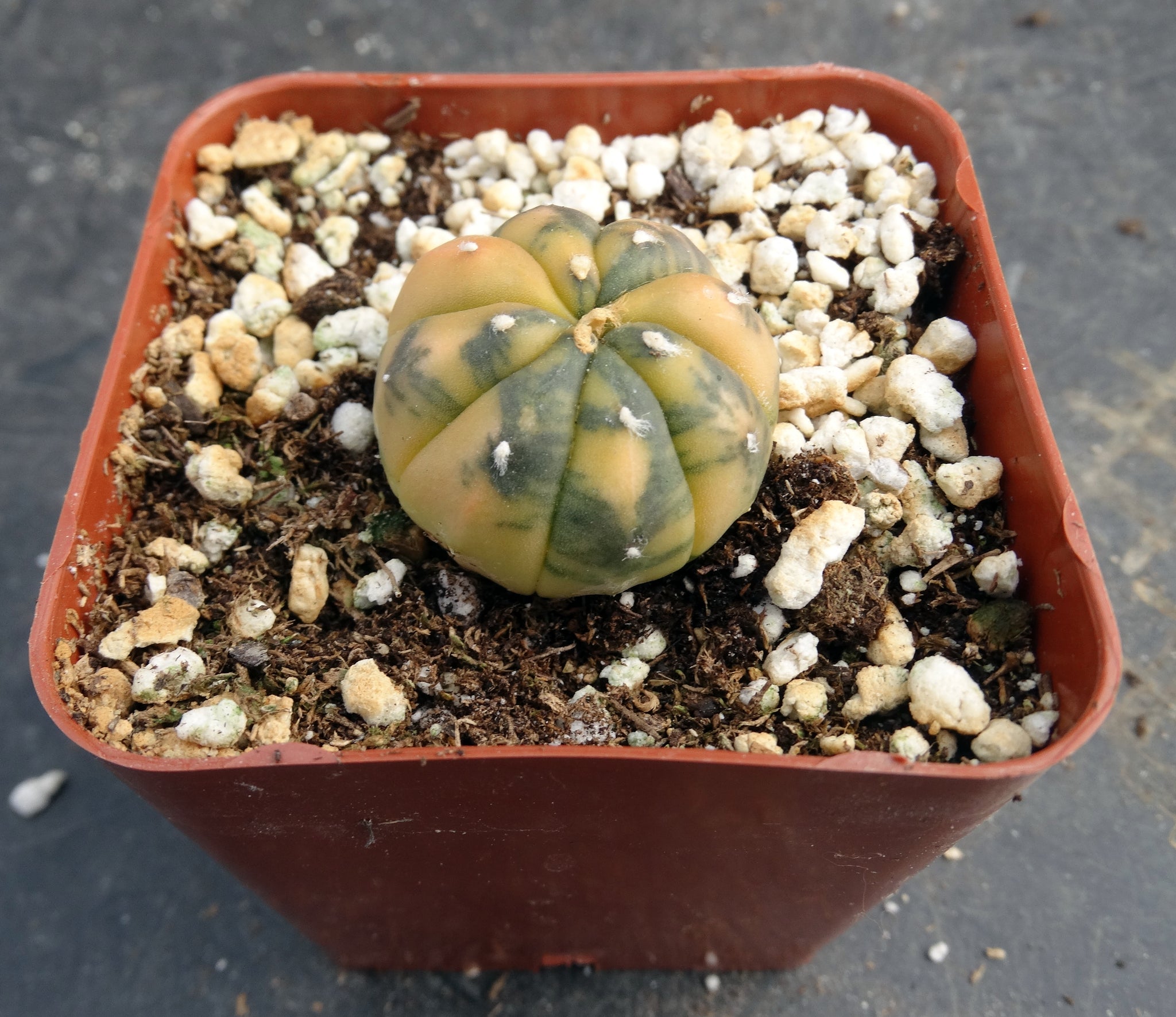 Astrophytum asterias 'variegata' Family: Cactaceae.   A beautifully variegated specimen the Sea Urchin cactus.  This is the nuda form of the species (it has some flecking) so it shows the variegation even better.  Makes beautiful yellow flowers with a red throat in summer.  Fairly easy to care for, except it can be very fussy about overwatering especially in winter.  In fact, you probably should water minimally if at all during the winter.  Can take light frost when more mature but best to protect when possible.