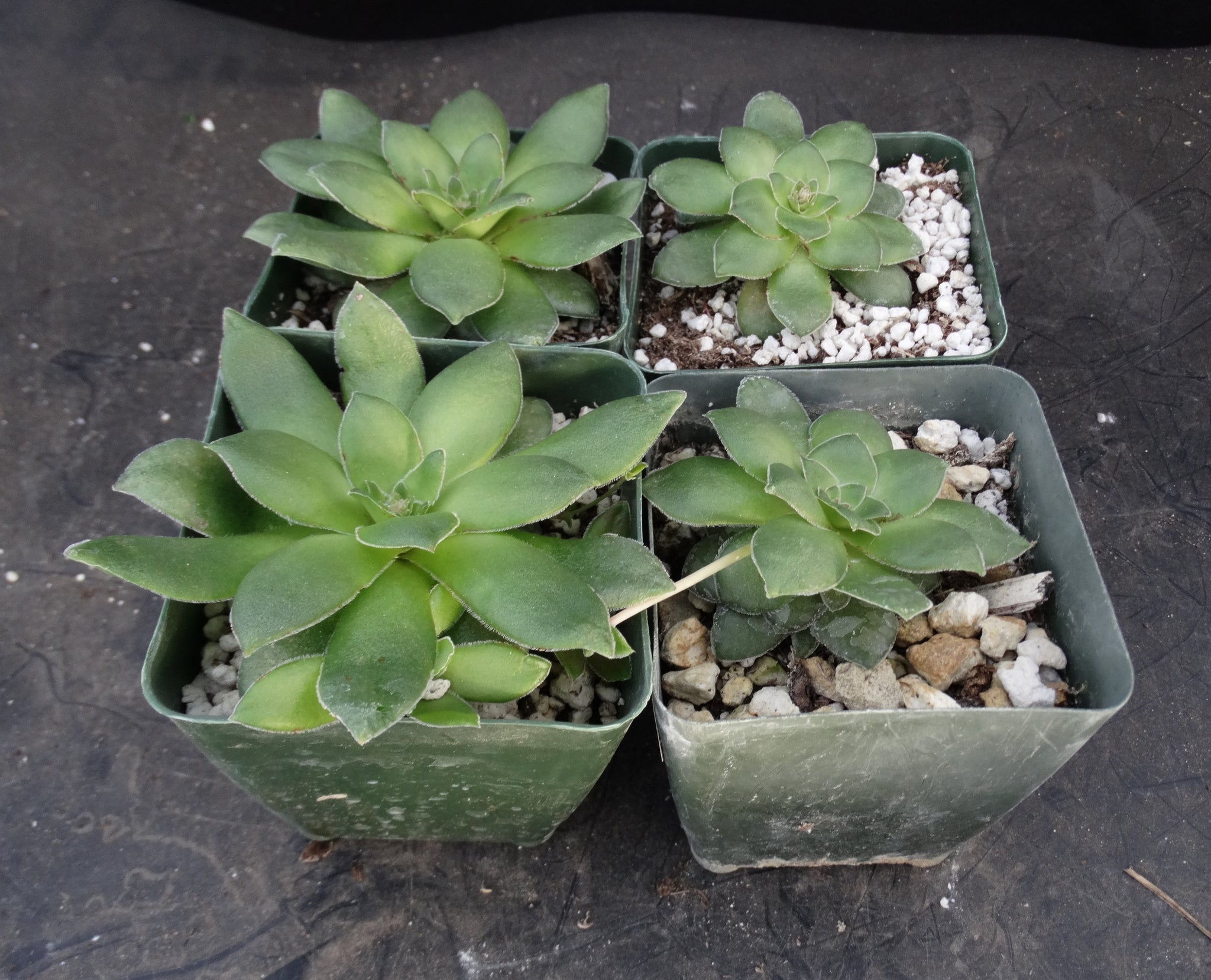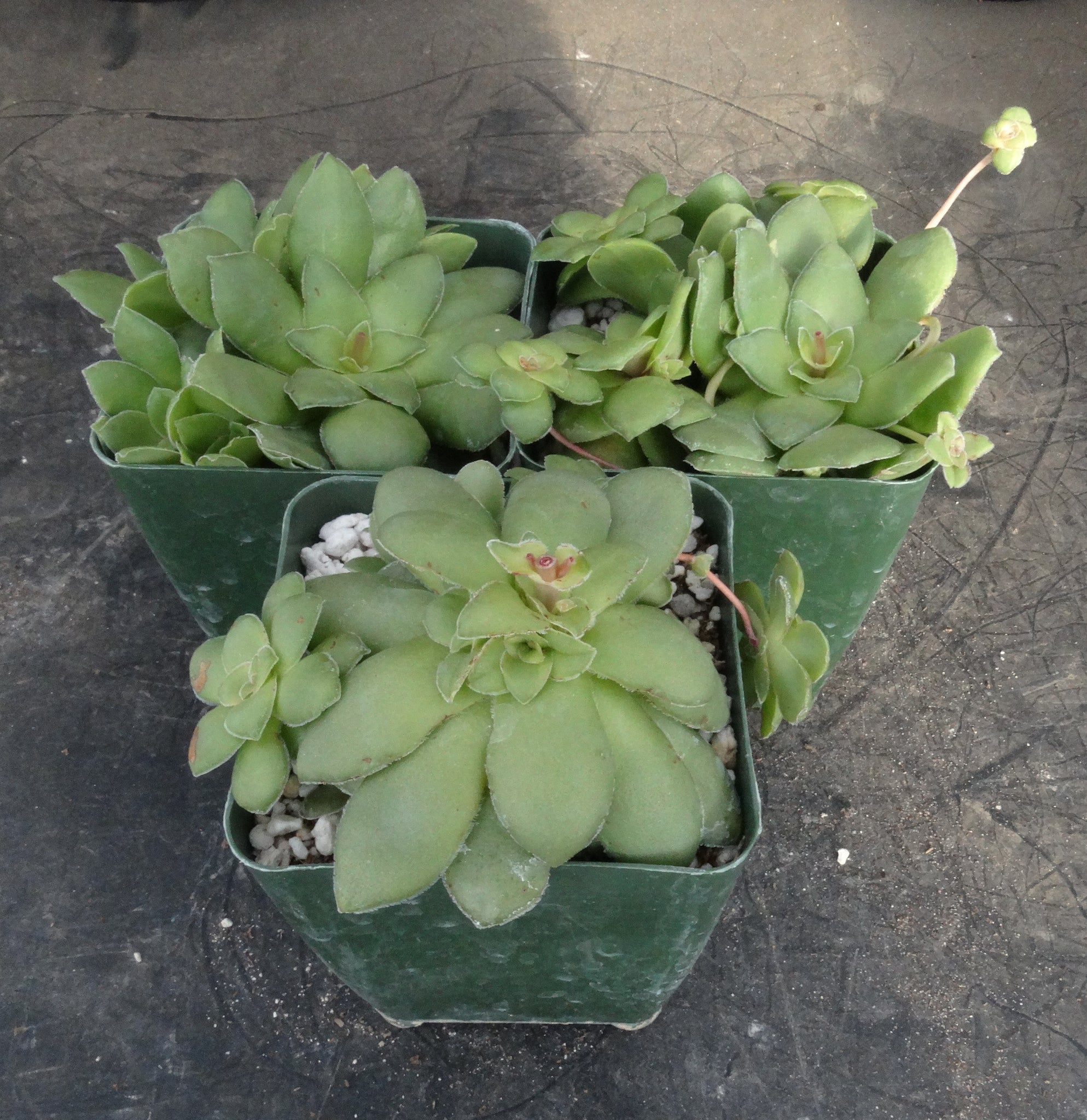 Crassula orbicularis  An attractive species with flat green leaves with fringe. The leaves are stacked on each other and look a lot like a small Aeonium. It stays compact but branches regularly in two distinct ways. First, it forms new rosettes right from the base, making a clump. Second, it produces offsets on stolons (stalks) that look like little green spiders on webs! Flowers in winter or early spring.  Not difficult to grow, just avoid overwatering, especially in summer as this is a winter grower. Protect from hot afternoon sun and freezing temps.