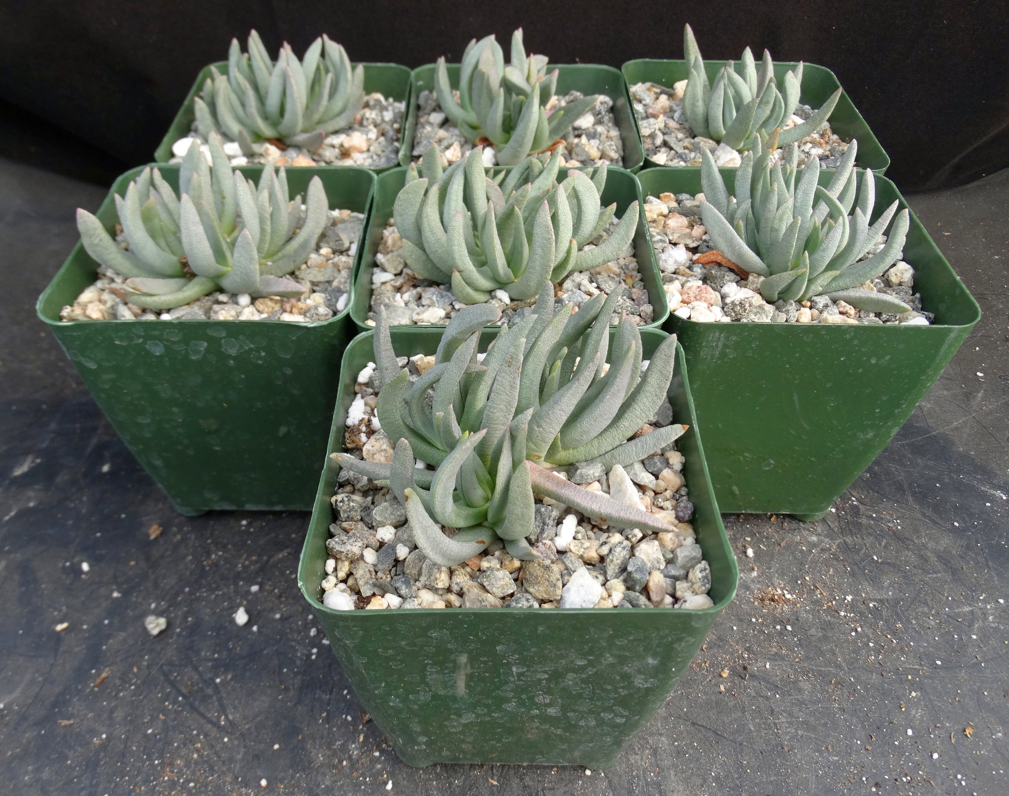Ebracteola wilmaniae An attractive little clumping Mesemb with long narrow blue green leaves. In the winter it often takes on a pinkish cast but most of the year the plant will be blue green. Produces white to pale pink flowers. Easy to grow. It is a something of a winter grower so give it more moisture in the cooler months and hold back on the water in the summer. Readily forms clumps. Protect from frost.