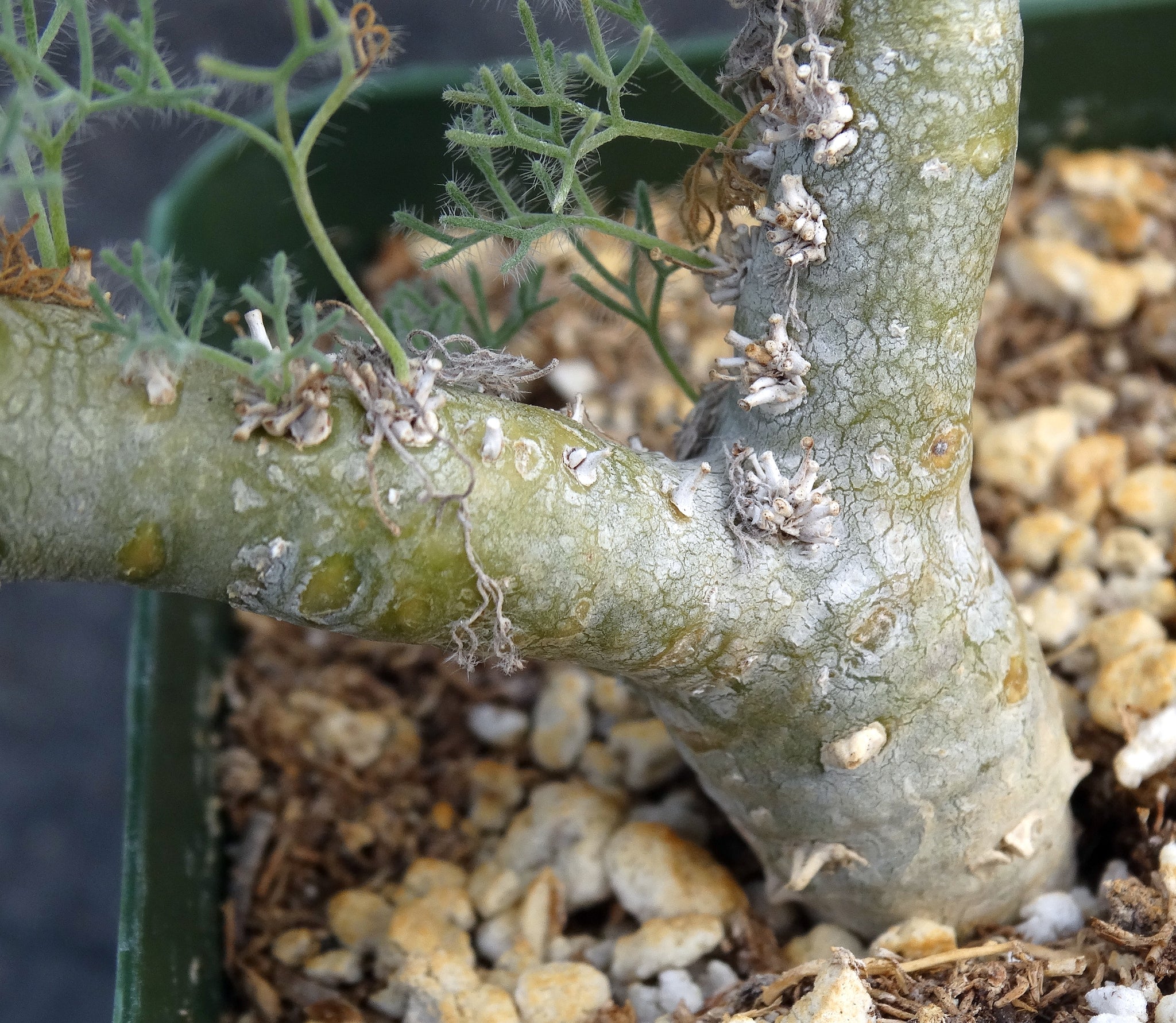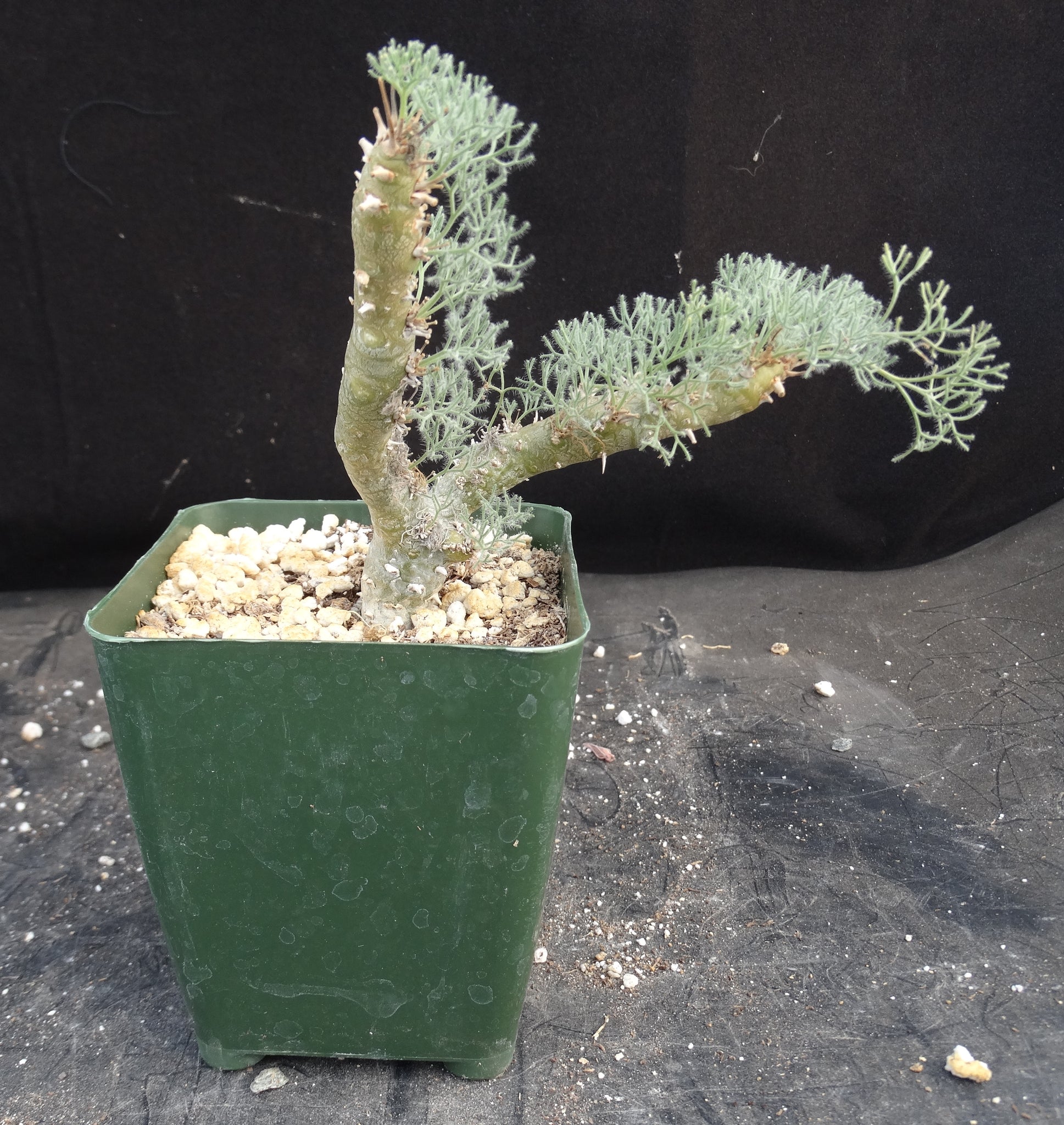 Sarcocaulon peniculine Also called Bushman's Candle, this South African native is closely related to the common Geranium and Pelargonium, but is adapted to desert conditions. Many people consider it to be a species of Monsonia. It produces fat stems that often grow horizontally a few inches above the ground. The leaves are small and fern-like. The petioles (leaf stalks) of each leaf turn into spines when the leaf dies. Flowers are an attractive white to light pink color. This plant commonly drops its leaves when stressed then regrows them when conditions are good.