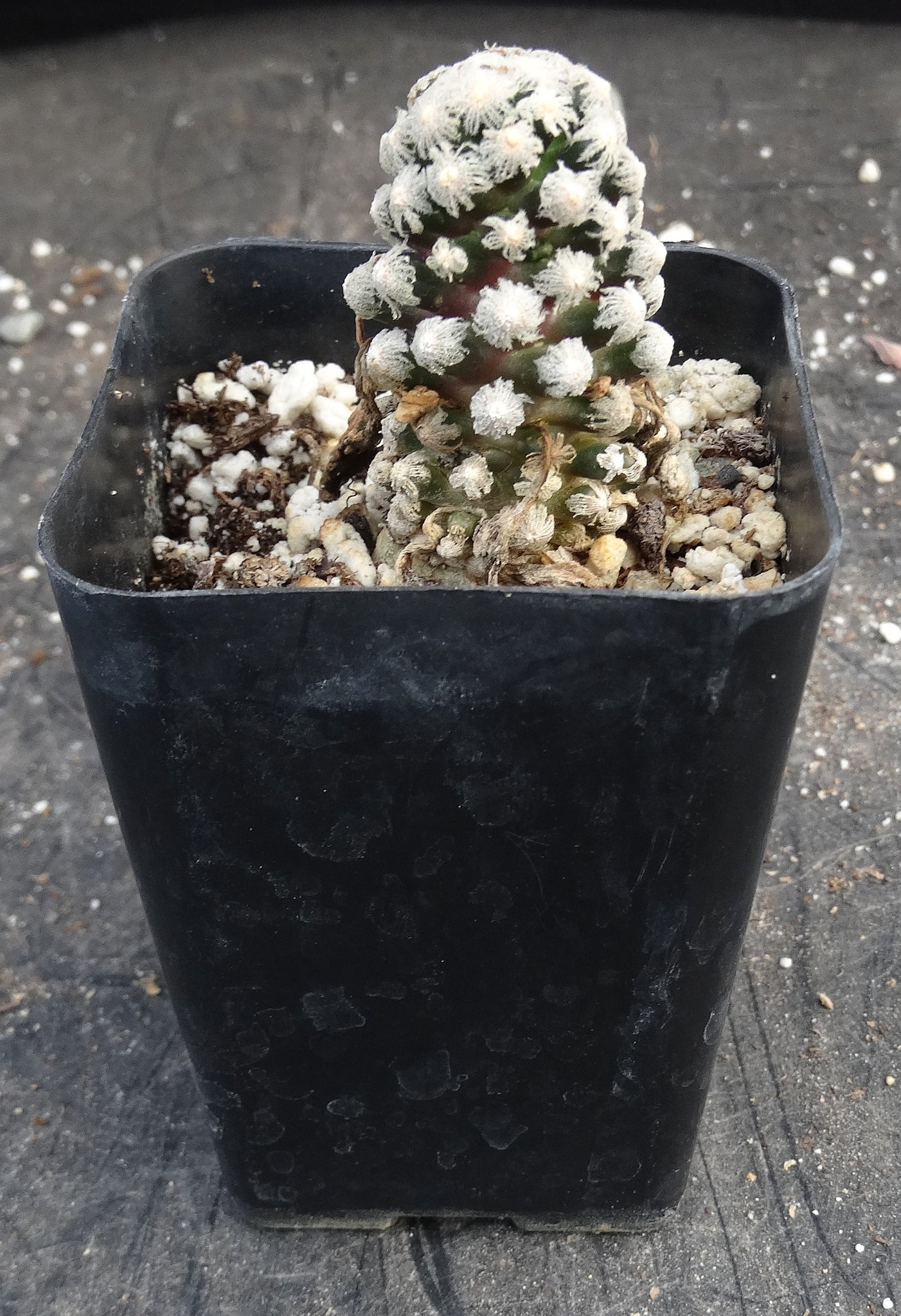 Mammillaria theresae A rarely seen miniature species. It is a small clumping species with very attractive spines at the end of each tubercle. They look like little umbrellas. Plant stays low and spreads very slowly. Flowers are purple-pink. Not difficult to grow, but is more fussy than a lot of Mammillarias and is a slow grower. In particular it is sensitive to overwatering, especially in the winter. Keep on the dry side an you should be ok. Protect from frost.