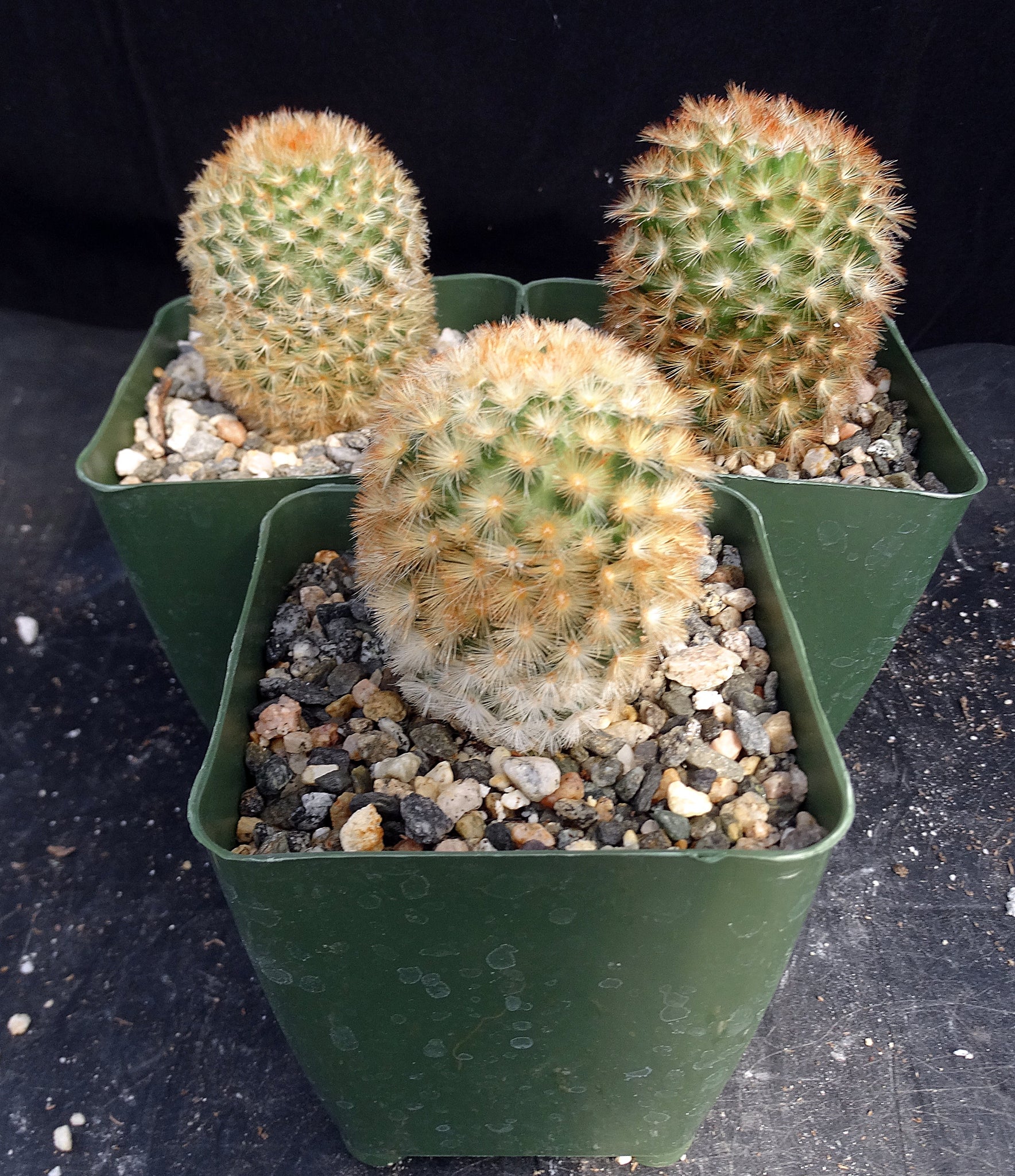 Mammillaria carmenae A medium sized species with thick, brush like spines that start white, become yellow, finally aging to orange.  Plant stays but grows upright and clumps in time.  Flowers yellow.  Takes normal cactus care.  Protect from frost.