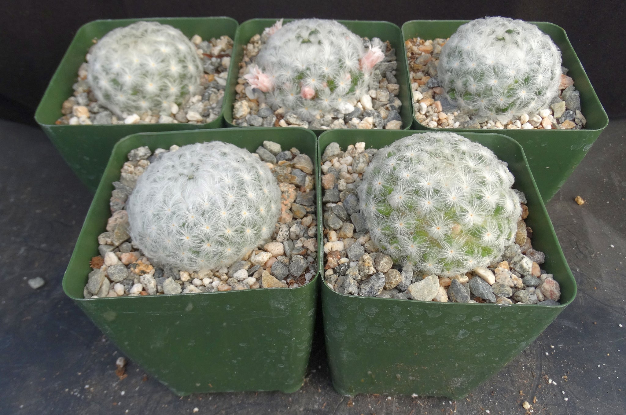 Mammillaria plumosa A very attractive clumping Mammillaria. The plant stays quite small is spineless (technically the plumes are spines, but they are quite soft). The tufts really do look like feathers or Dandelion plumes. Flowers regularly, with pink to yellow flowers depending on the individual.