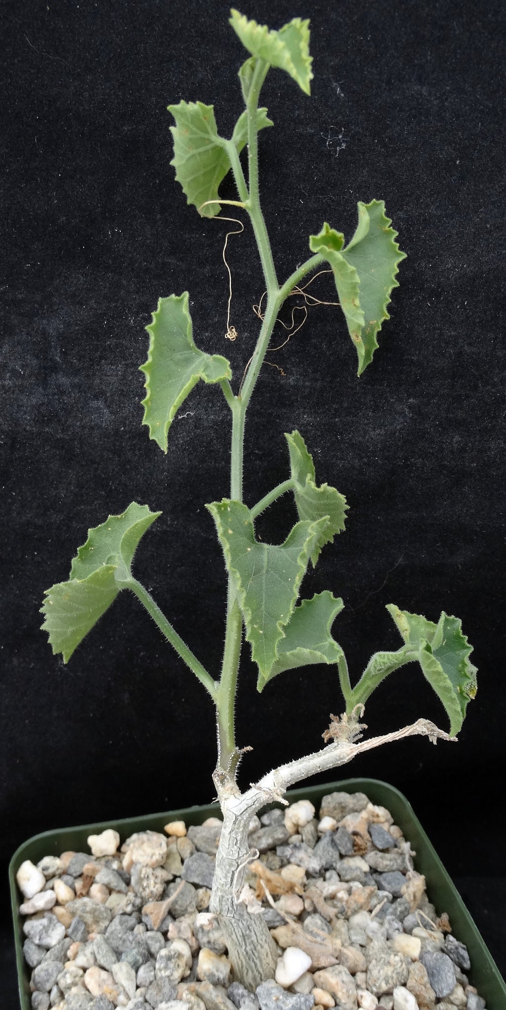 Corrallocarpus bainesii Family: Curcurbitaceae. An attractive caudiciform vine with serrated, heart shaped leaves. The caudex is a combination of the taproot and the base of the stem. The caudex grows larger faster when the root portion is below the soil. Many growers keep the root buried for several years then raise it once the plant starts to mature. But it will form a caudex if the root is raised early, just slower. Vines can be trimmed to shape or allowed to scramble around. Likes lots of light and regular watering during the growing season. Protect from frost.