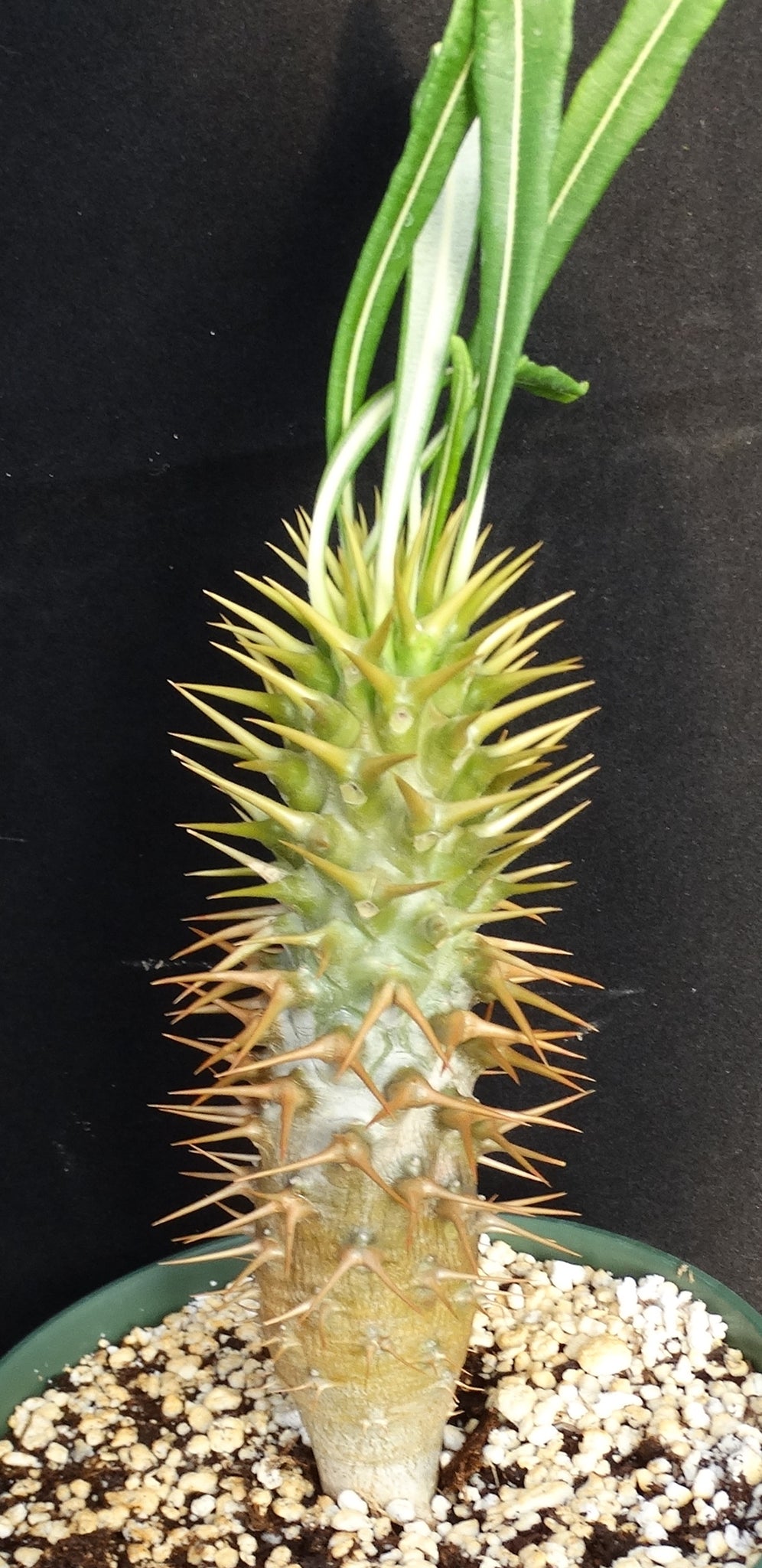 Pachypodium  Ambongense One of the rarest and largest species of Pachypodium.  It can reach 20 feet tall or more in the wild. In pots you can keep it around 3-5 feet tall.  Not difficult to grow.  Can survive temperatures down to freezing, but prefers it a bit warmer in winter if possible (that is true for all Pachypodiums).  Likes water during the growing season as long as it is in well drained soil.  Should be kept fairly dry in the winter, especially after it drops its leaves.