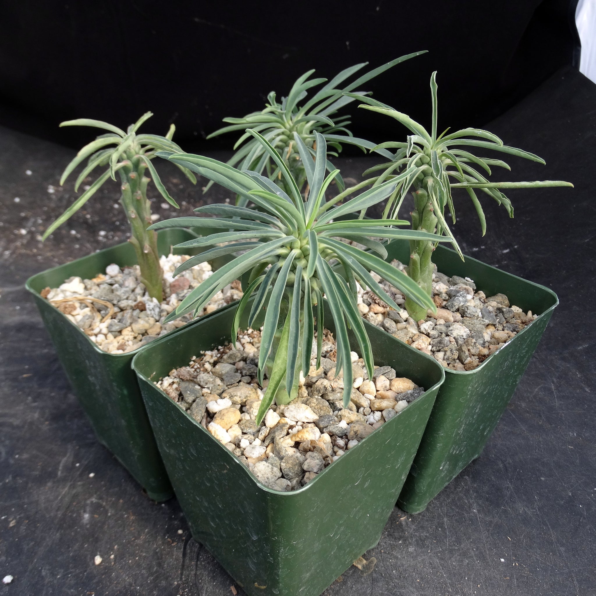Euphorbia pubiglans An attractive leafy, stem forming species of from Madagascar. The stems are more or round with prominent leaf scars. The leaves are lance shaped. Water regularly in summer, keep dry in winter. Protect from frost.