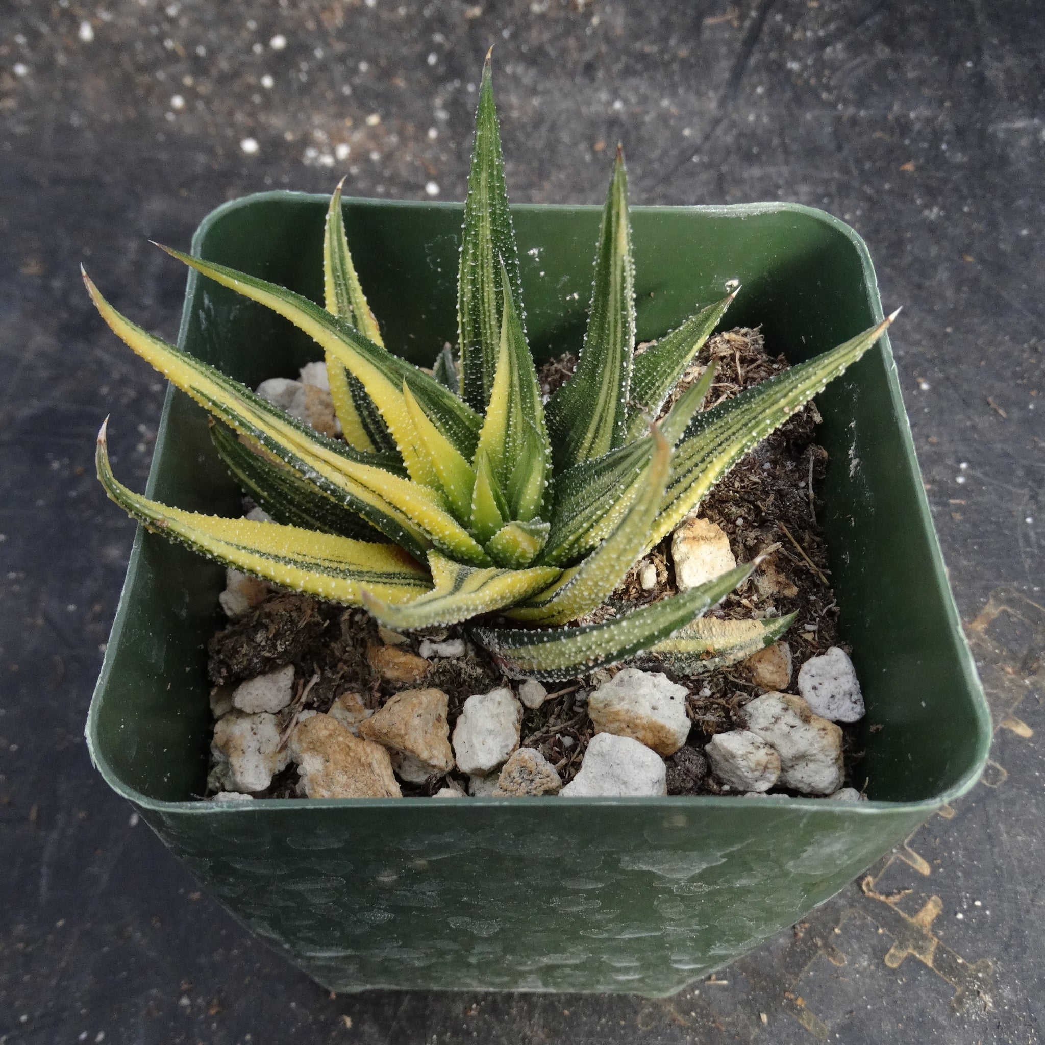 Haworthia radula 'variegata' A nice variegated plant of this attractive species. Now considered to be part of Haworthiopsis. Forms clumps in time. Plants flower off and on all year round. Easy to grow. Haworthias are more shade tolerant than most succulents, but still needs good light. Protect from frost.
