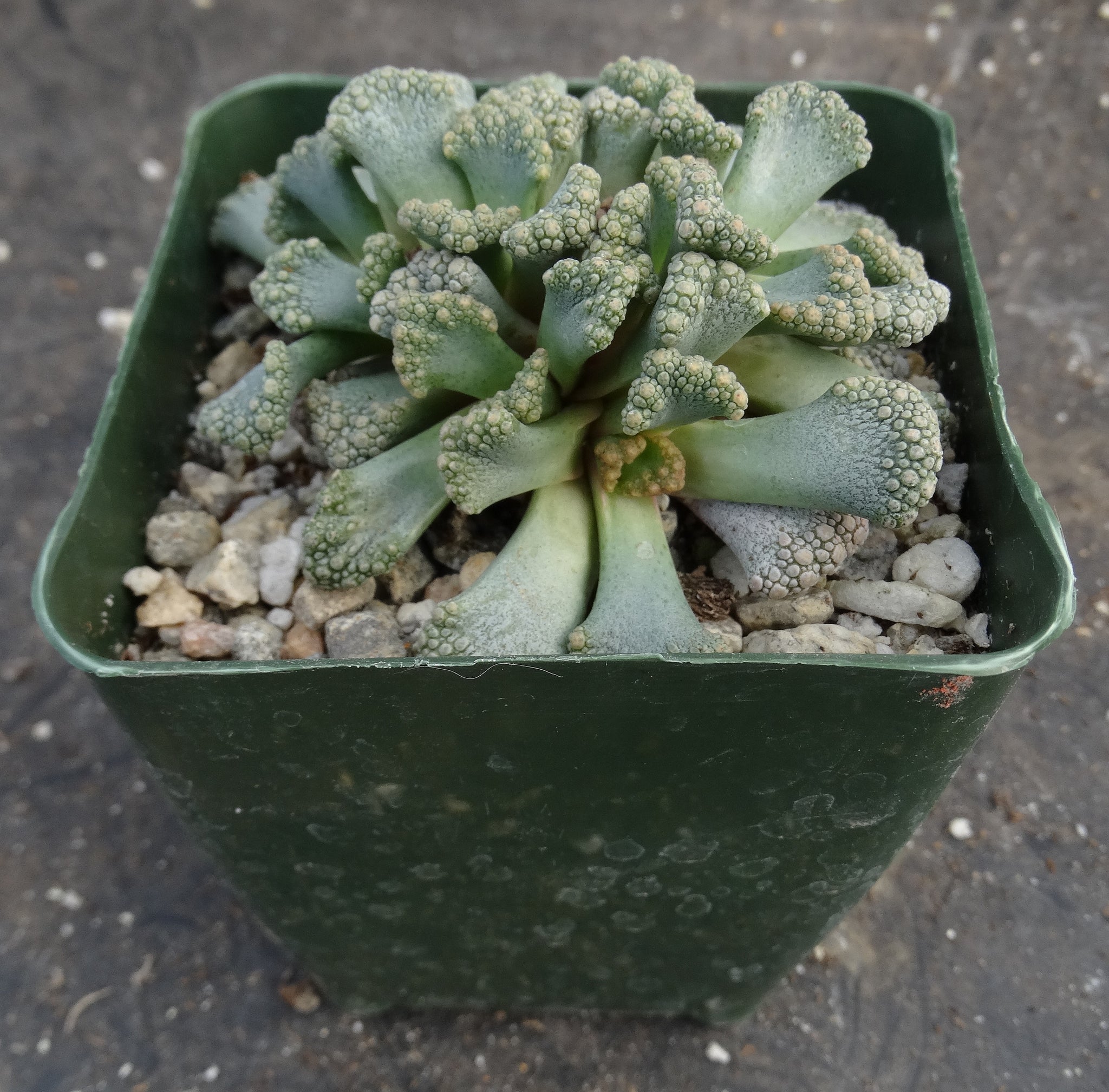 Titanopsis calcarea An attractive little clumping Mesemb with warty blue-green leaves. Flowers yellow. Easy to grow. Unlike a lot of this type of mesemb, this species is a summer grower. Readily forms clumps. Protect from frost.