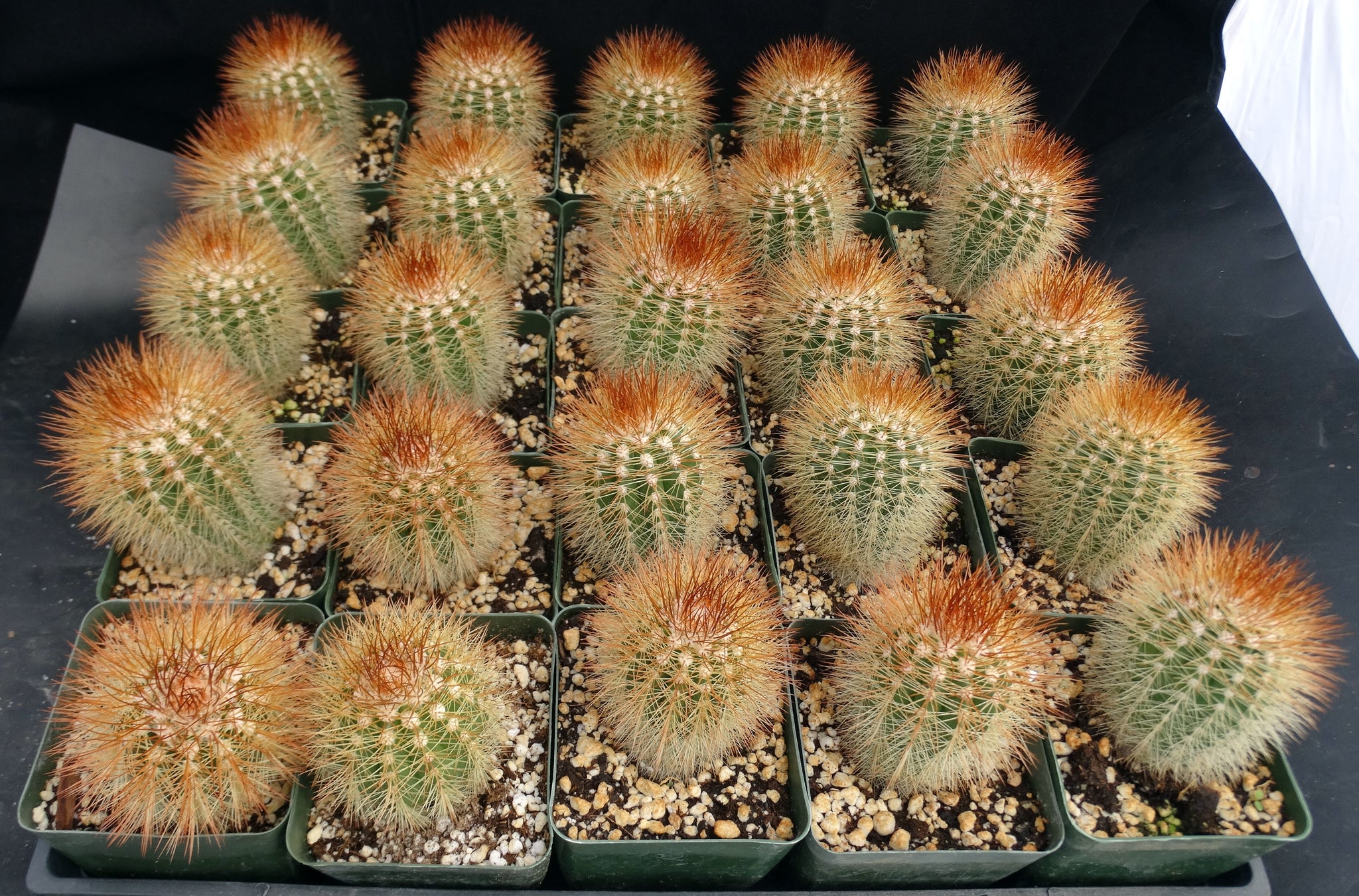 Melocactus perezassoi Family: Cactaceae. A nice cephallium forming cactus. When young (as they are now) they seem like a regular green cactus but once it gets big enough the main plant stops growing but produces a large hairy inflorescence that continues to grow for the rest of the life of the plant. Eventually the inflorescence can be taller than the plant itself. This is more tropical than most cacti so it doesn't like cold weather and it also doesn't like to fully dry out. Occasionally drying out is fine but in general water when the soil is slightly moist. Needs good light. Protect from frost.