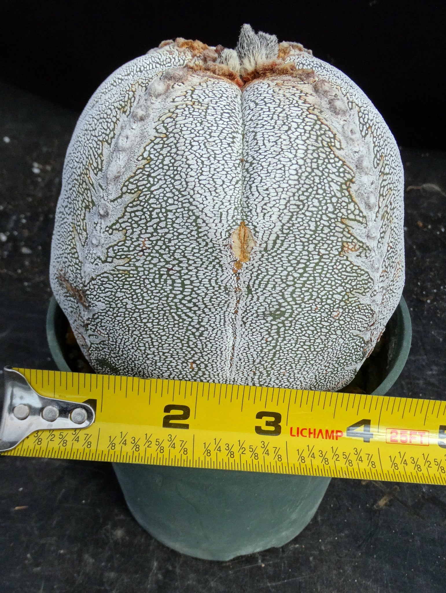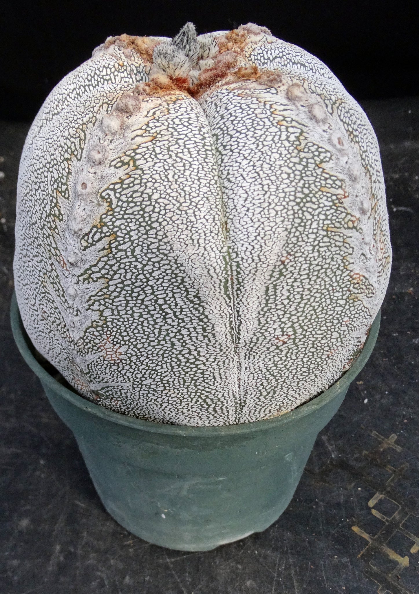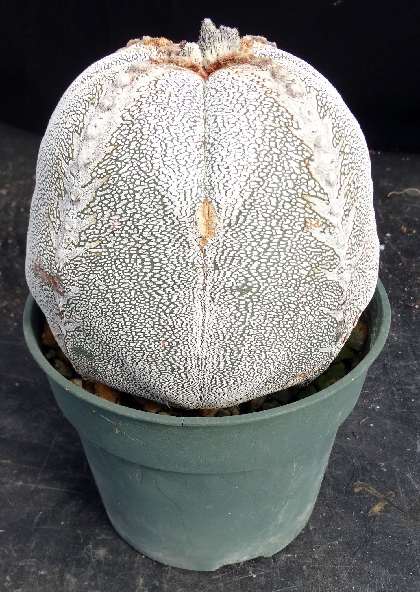 Astrophytum myriostigma 'Onzuka' The Bishop's Cap cactus. A very attractive form of one of the most popular of all small cacti, this species is spineless. It is covered in dense white felt that is much thicker than the normal form of the species. Flowers bright yellow and produced throughout the summer. This is the rarer, 4 rib form of the variety. Easy to grow, just give normal cactus care. This variety is a bit more sensitive to overwatering than the normal form of the species. Protect from frost.